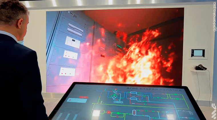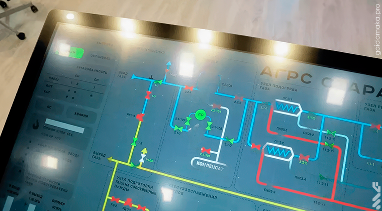 If you watched the video, you probably noticed that our VR model includes a touchscreen table, a display screen, and a virtual reality headset. The image on the touchscreen table is fully synchronized with the mnemonic diagram on the operator’s screen and reflects the current state of the entire gas distribution station.